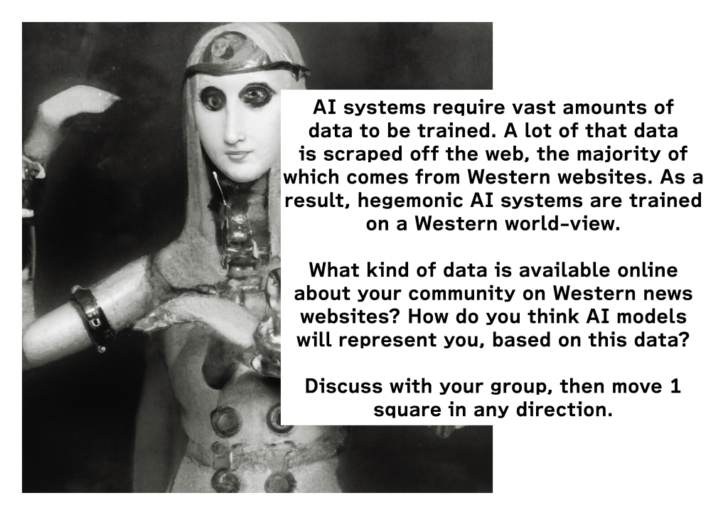 In this game, the players have to collectively fight against AI colonialism by collaboratively collecting all Fragments of Decolonial AI that have been scattered across the island, to create speculative Cypriot AI systems, while avoiding having their data scraped by the Web Scraper. To reach the Fragments, players move along the game board, following the instructions on the player cards. The cards will prompt collective reflection on how AI colonialism impacts the local Cypriot communities and investigate what kinds of power asymmetries are at play — both on a global level, but also within Cypriot society. Not everyone will be impacted by AI the same way.